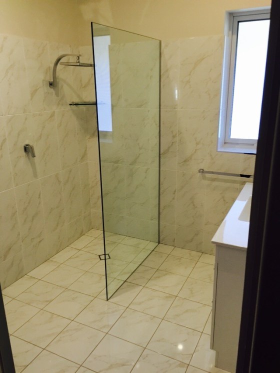 Walk in shower with 10mm toughened glass shower screen, window replaced with aluminium awning window.