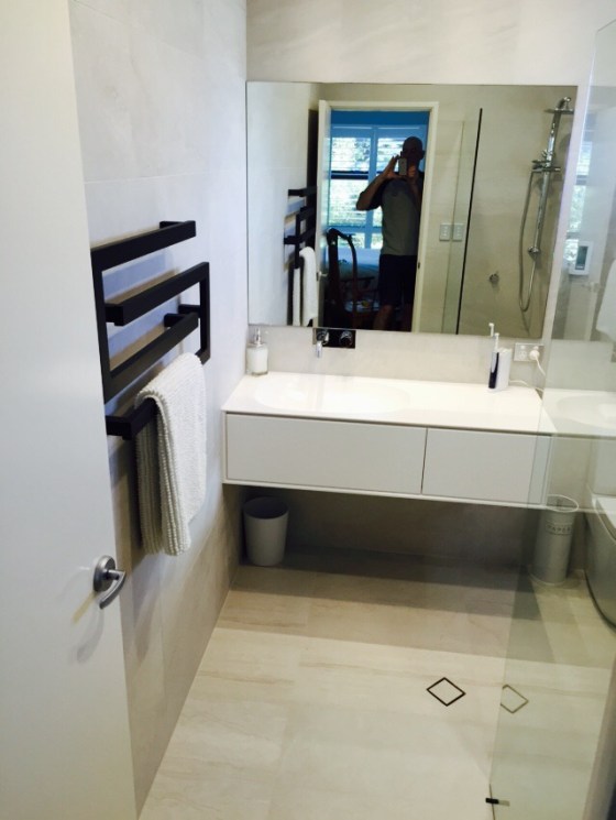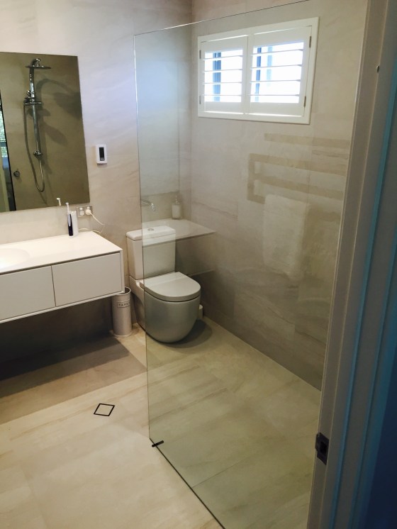 Electric underfloor heating install, 10mm toughened glass shower screen, water resistant window shutters installed. Fixtures supplied through Reece plumbing.