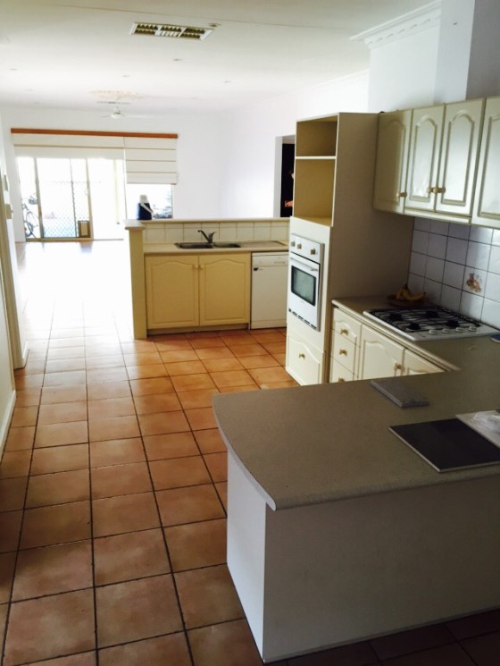Before & after photo. Floor tiling, ceiling bulkheads & cabinets