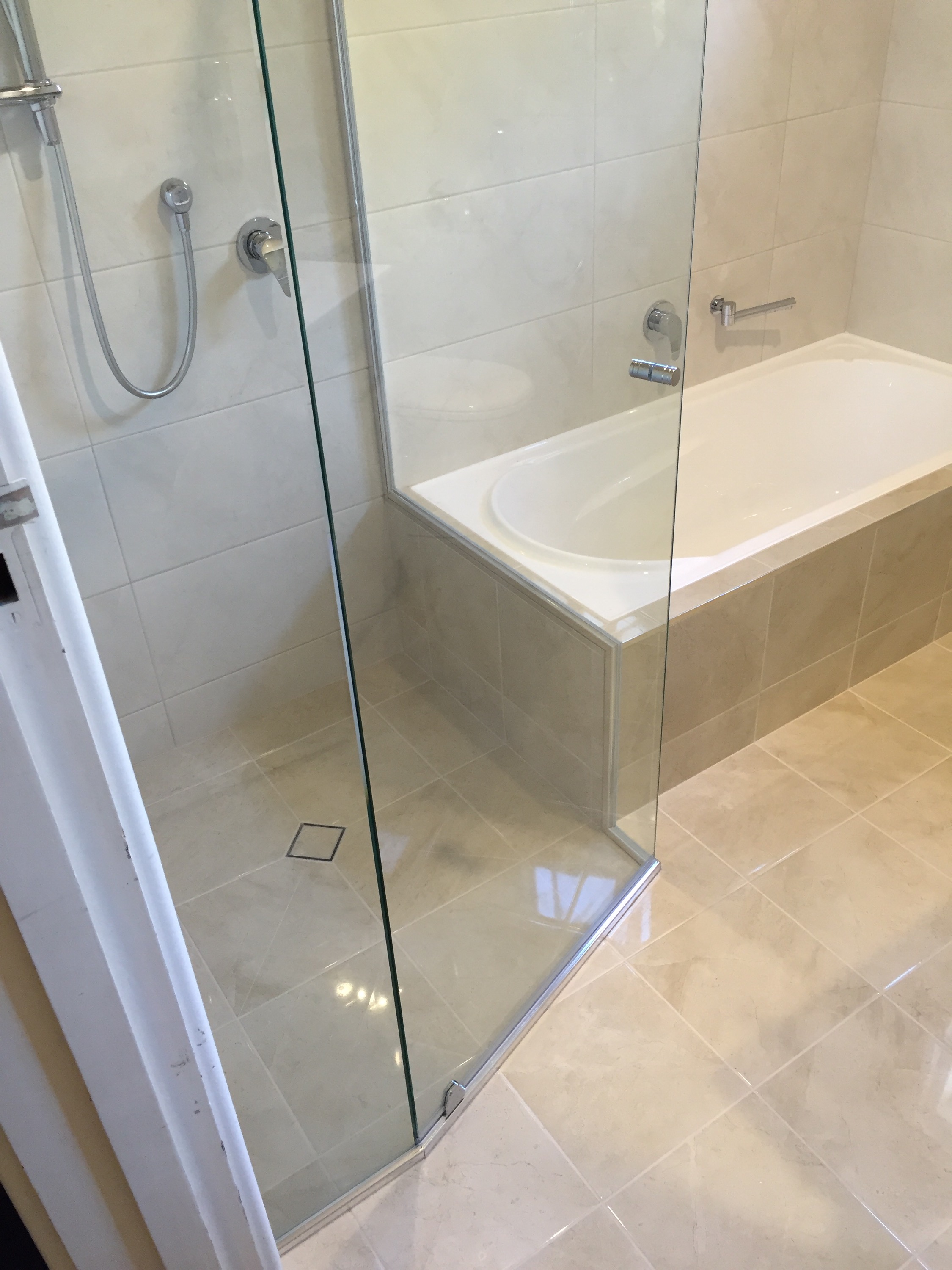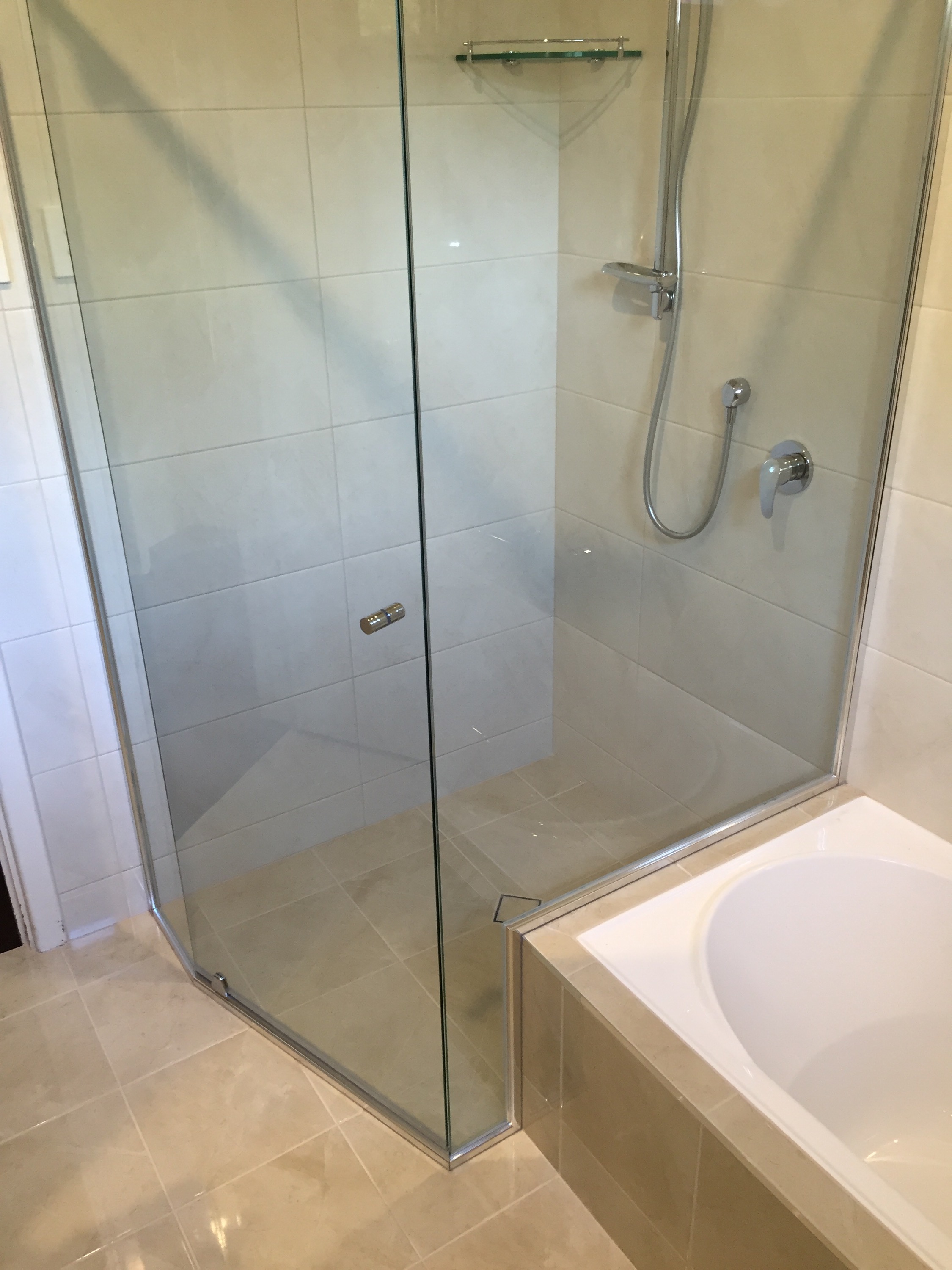 3sided semi-frameless shower screen, odd angle & dog leg section sitting on bath end.