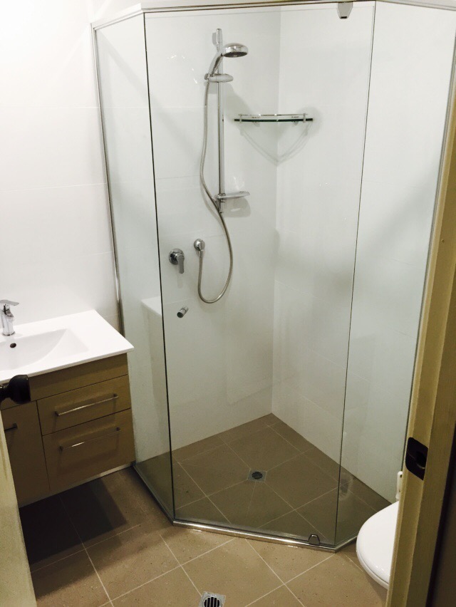 Compact bathroom, three sided semi-frameless shower screen with pivot door. Wall mounted vanity unit