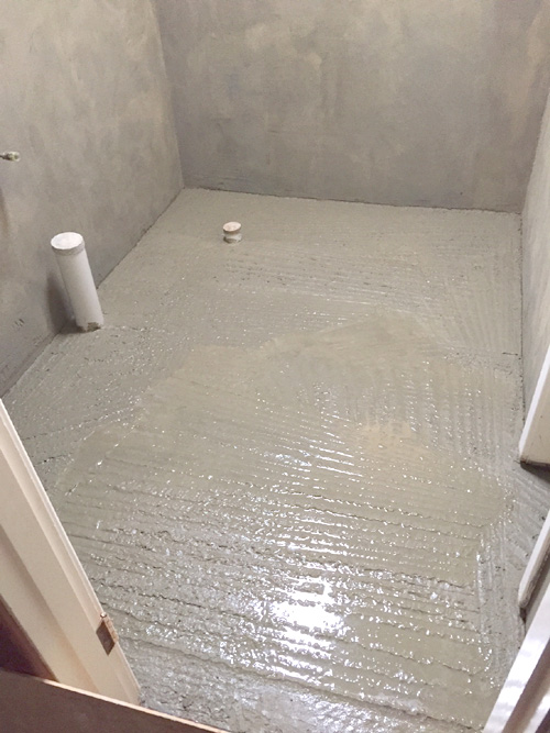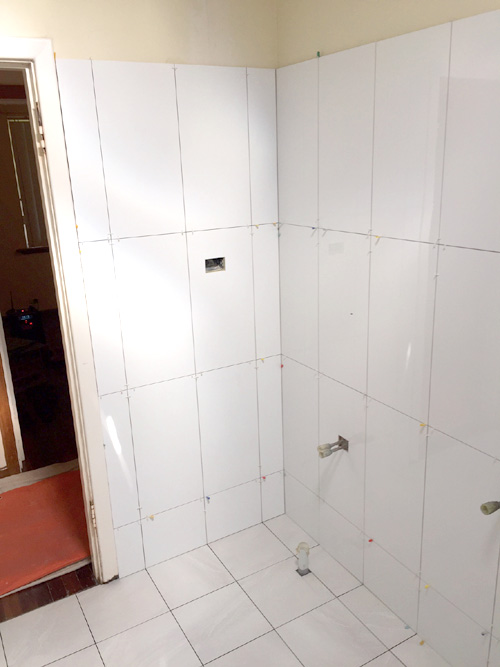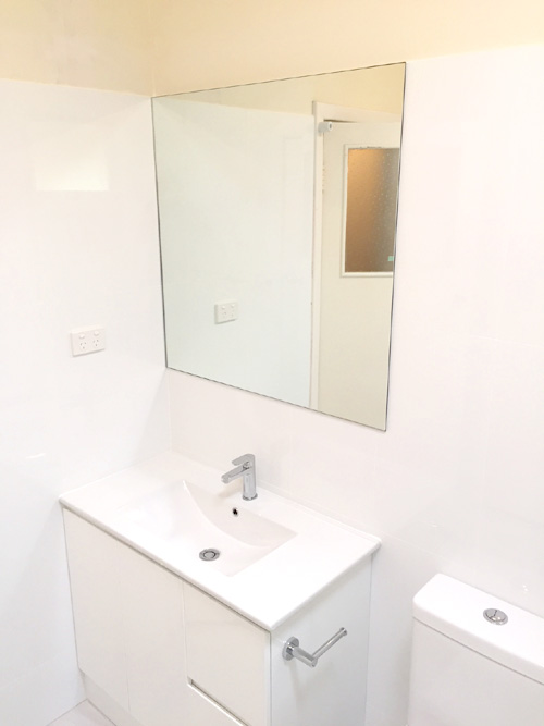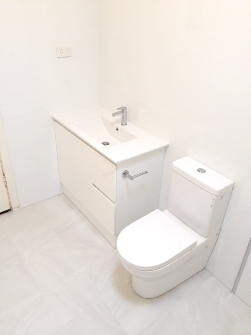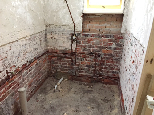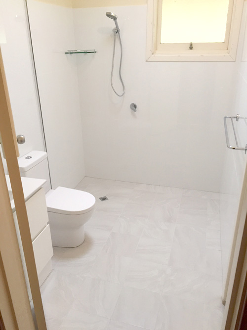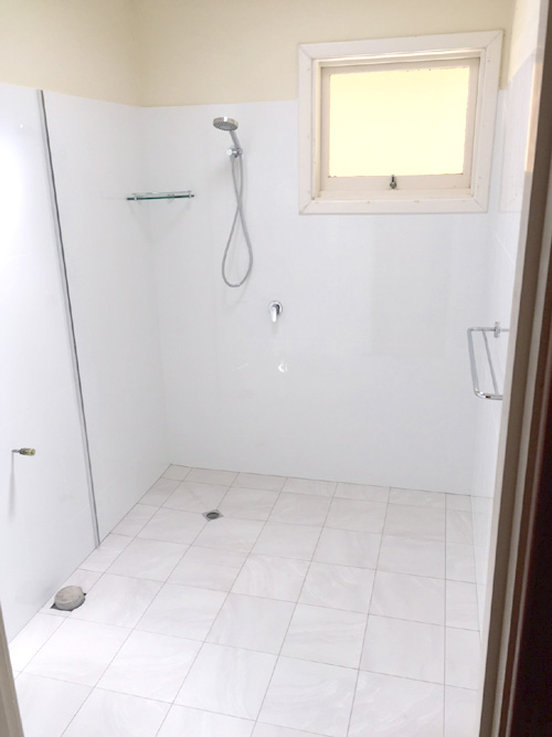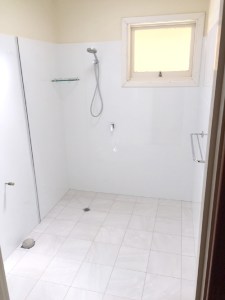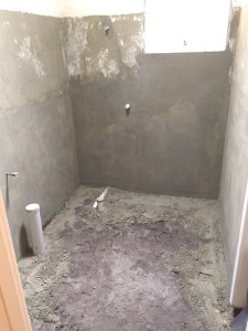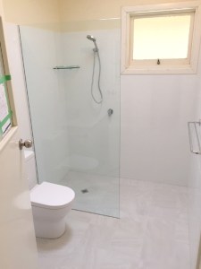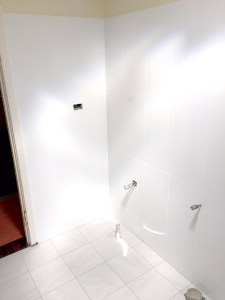 There are some ‘before’ photos, ‘during’ and ‘after’ so you can see the progress and transformation. The job involved removing the floor slab, replacing all plumbing. The hot & cold copper pipework in floor had corroded & burst. A WC was added to the bathroom, a new concrete floor slab, tiling to 2 metres high, fixtures were moved around, 10mm fixed shower panel added plus walk in shower (wet room )…