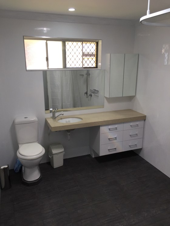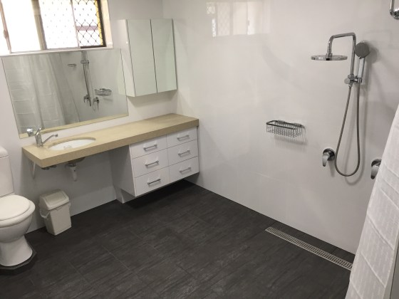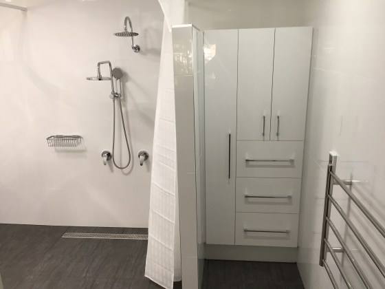 Electric heated floor, bespoke cabinets with stone top, floor to ceiling tiling.