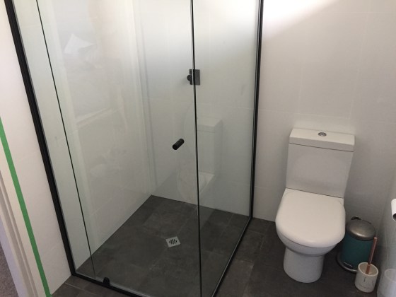Shower screen, semi-frameless Matt black frame with pivot door.