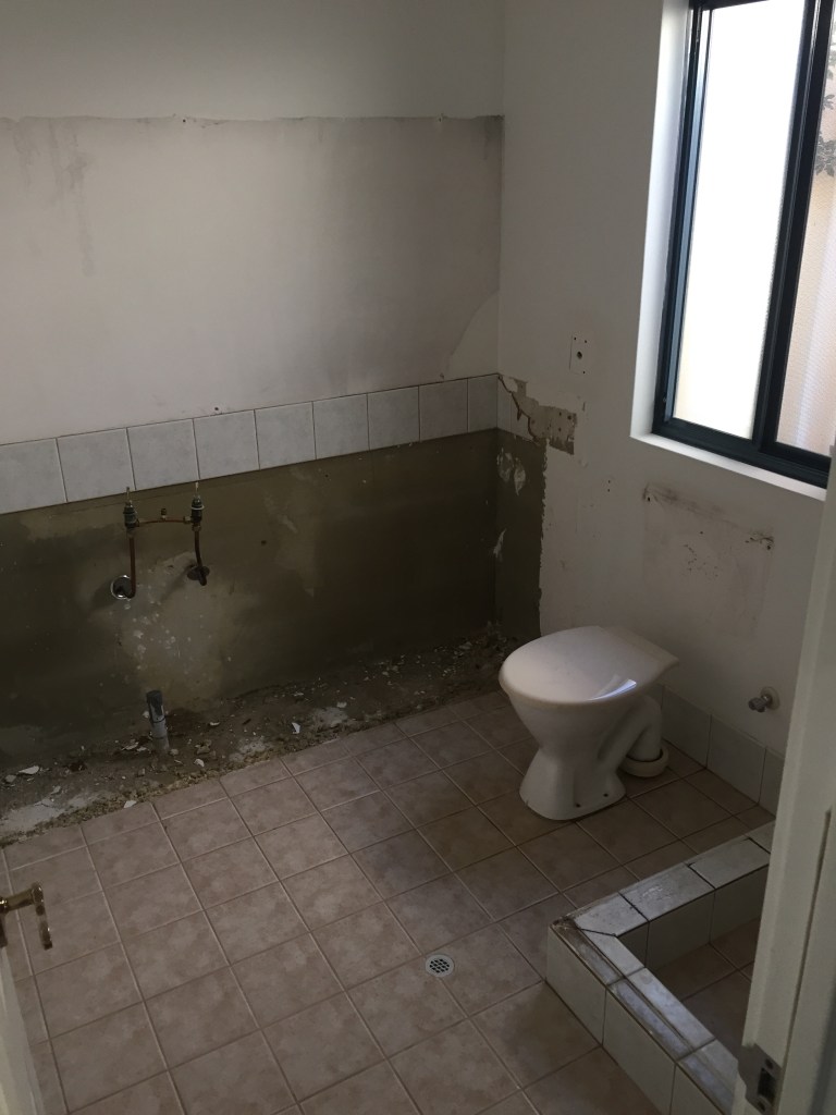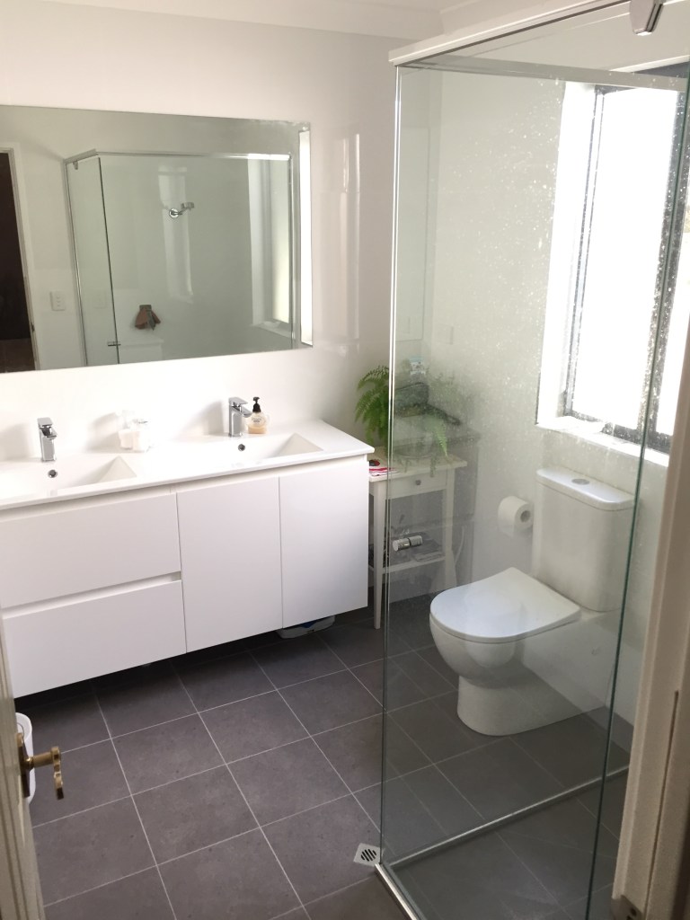 En-suite renovation, removal of existing fixtures & tiles. Enlarging shower recess, installation of semi-frameless shower screen, tiling to ceiling, providing plumbing for double bowl vanity unit.