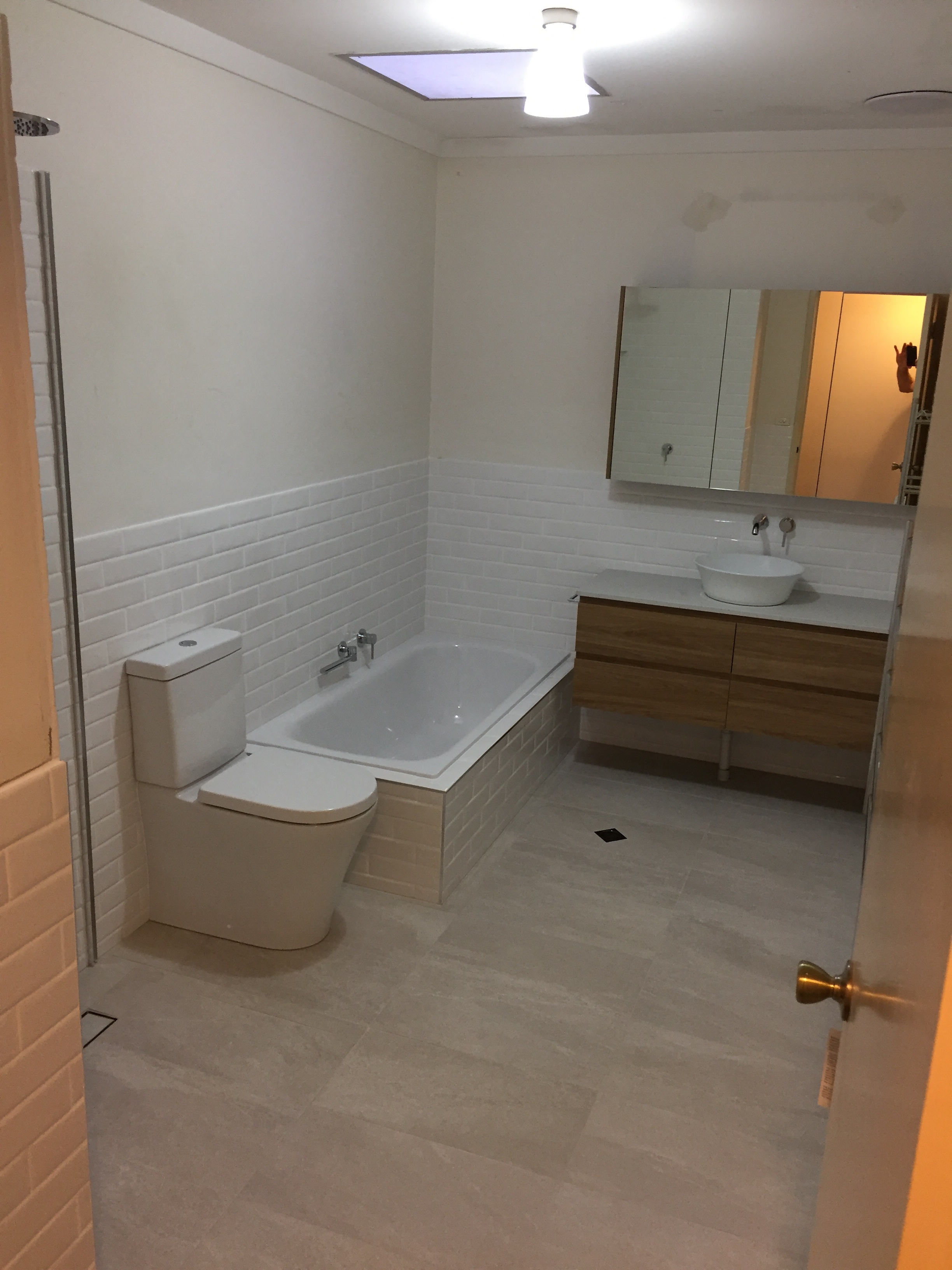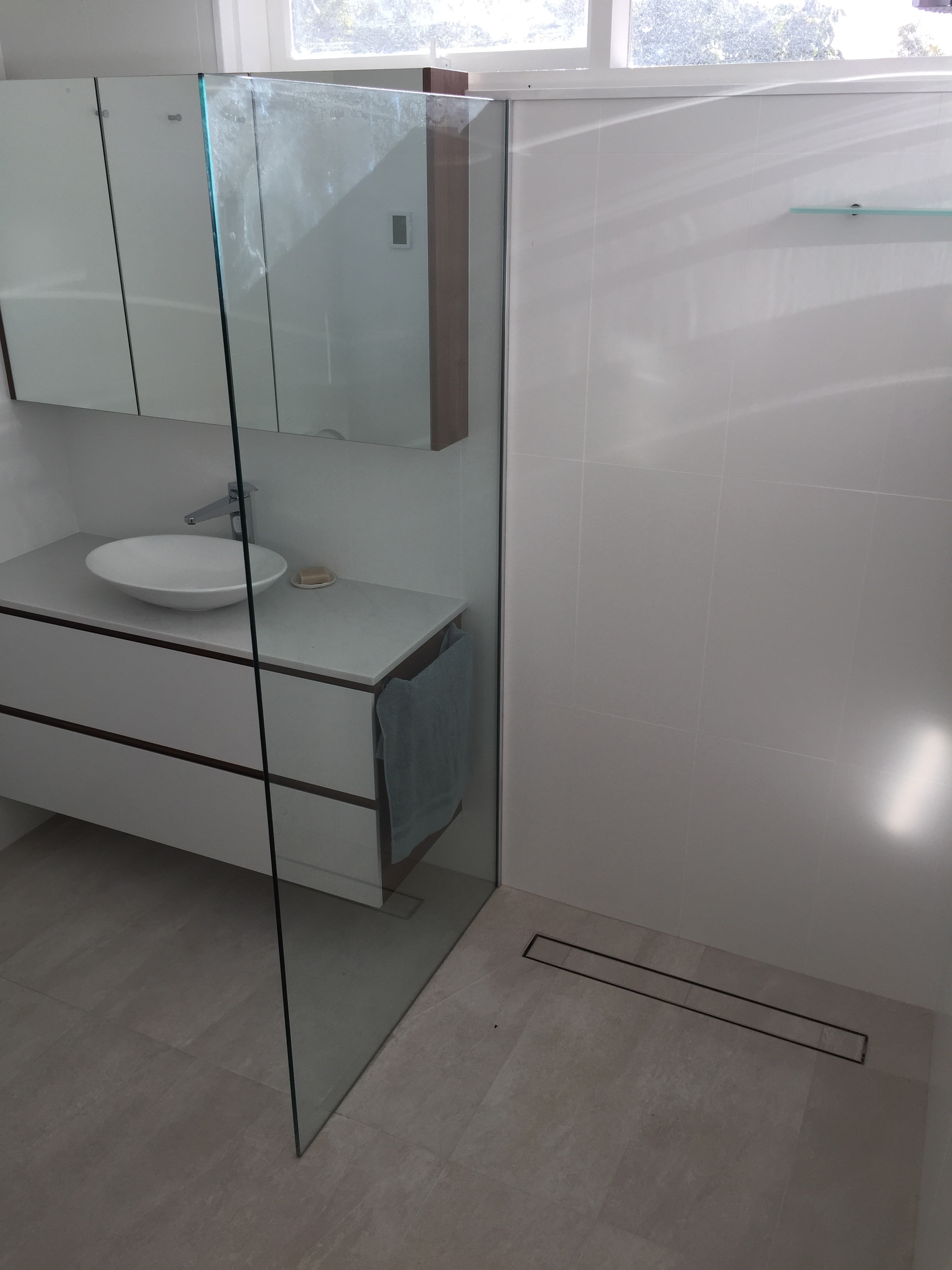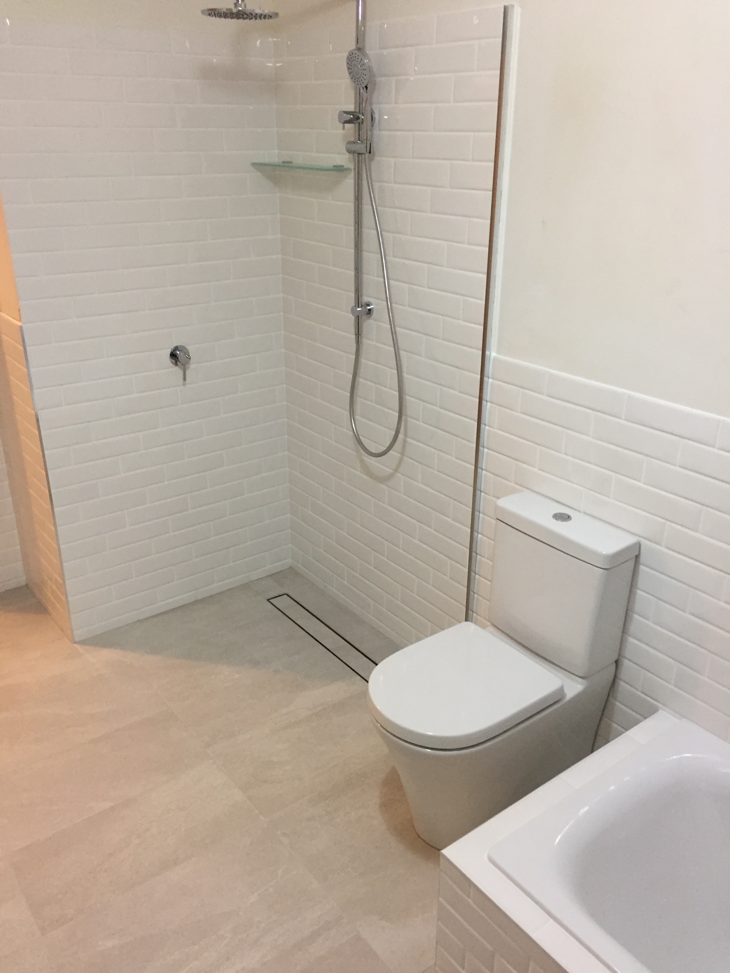 Bathroom renovation, renewal of fixtures, forming of walk in shower with channel floor waste ( screen not installed in photos)