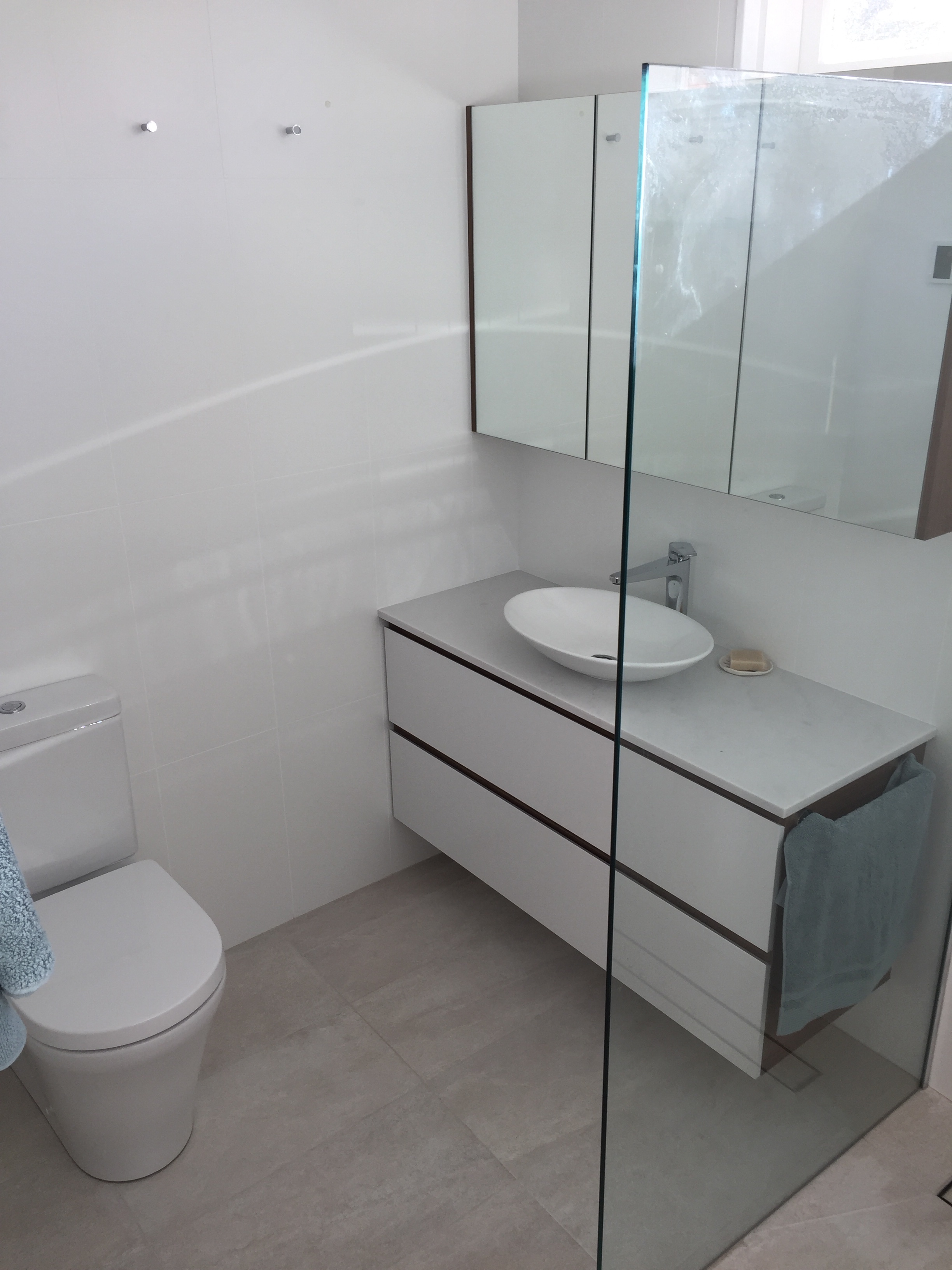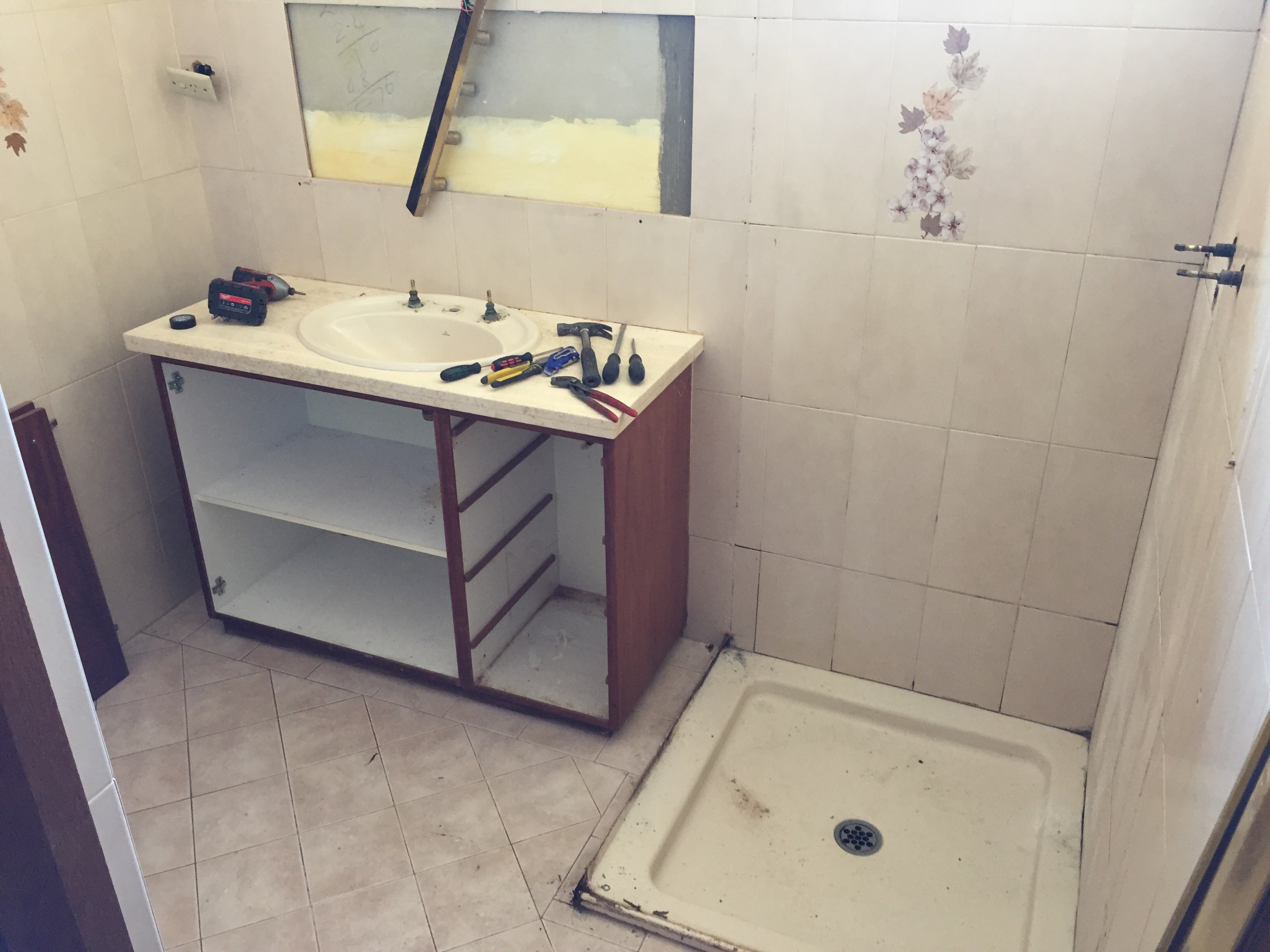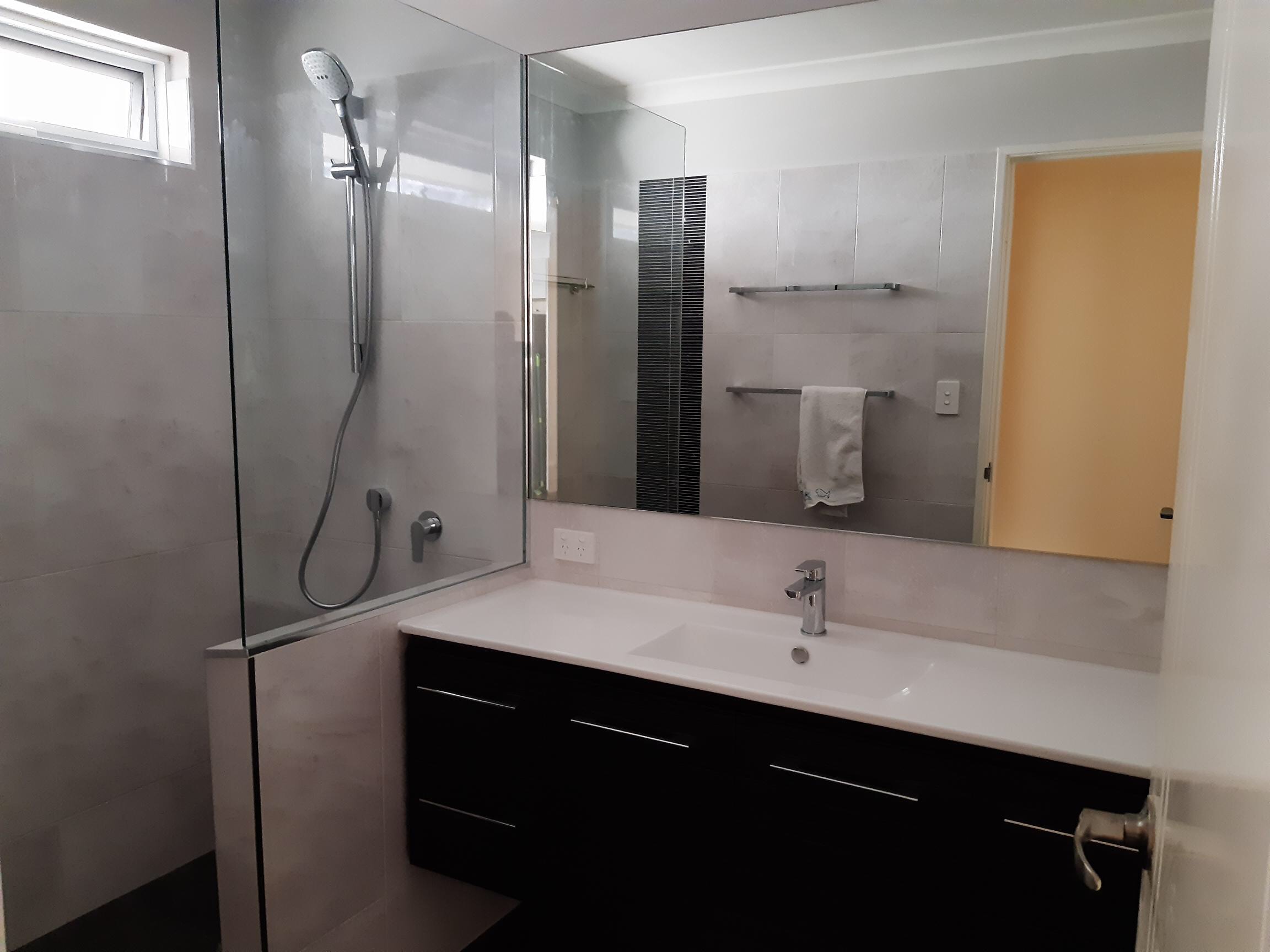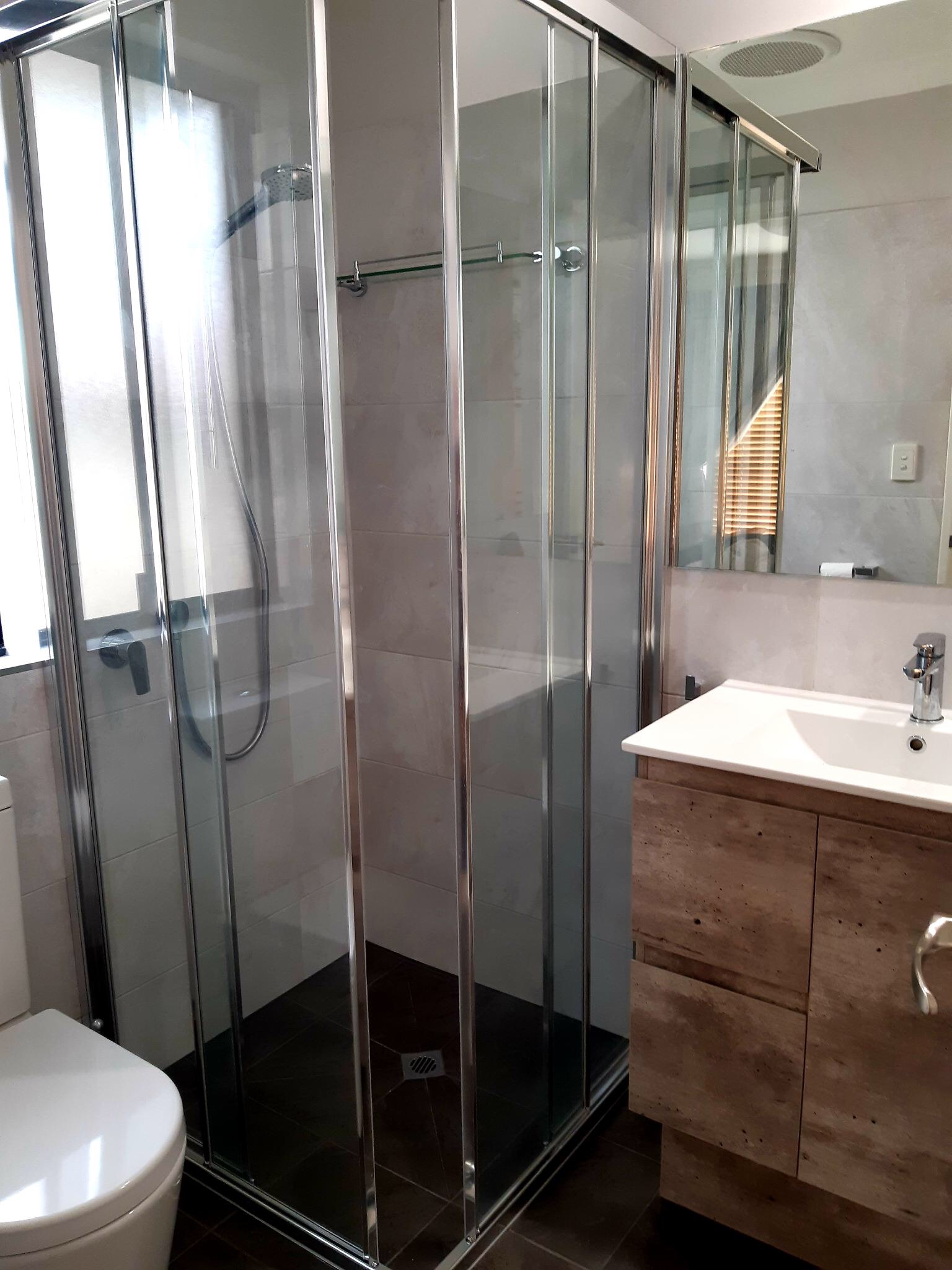 Bathroom renovation, renewal of fixtures, forming of walk in shower with channel floor waste ( screen not installed in photos)