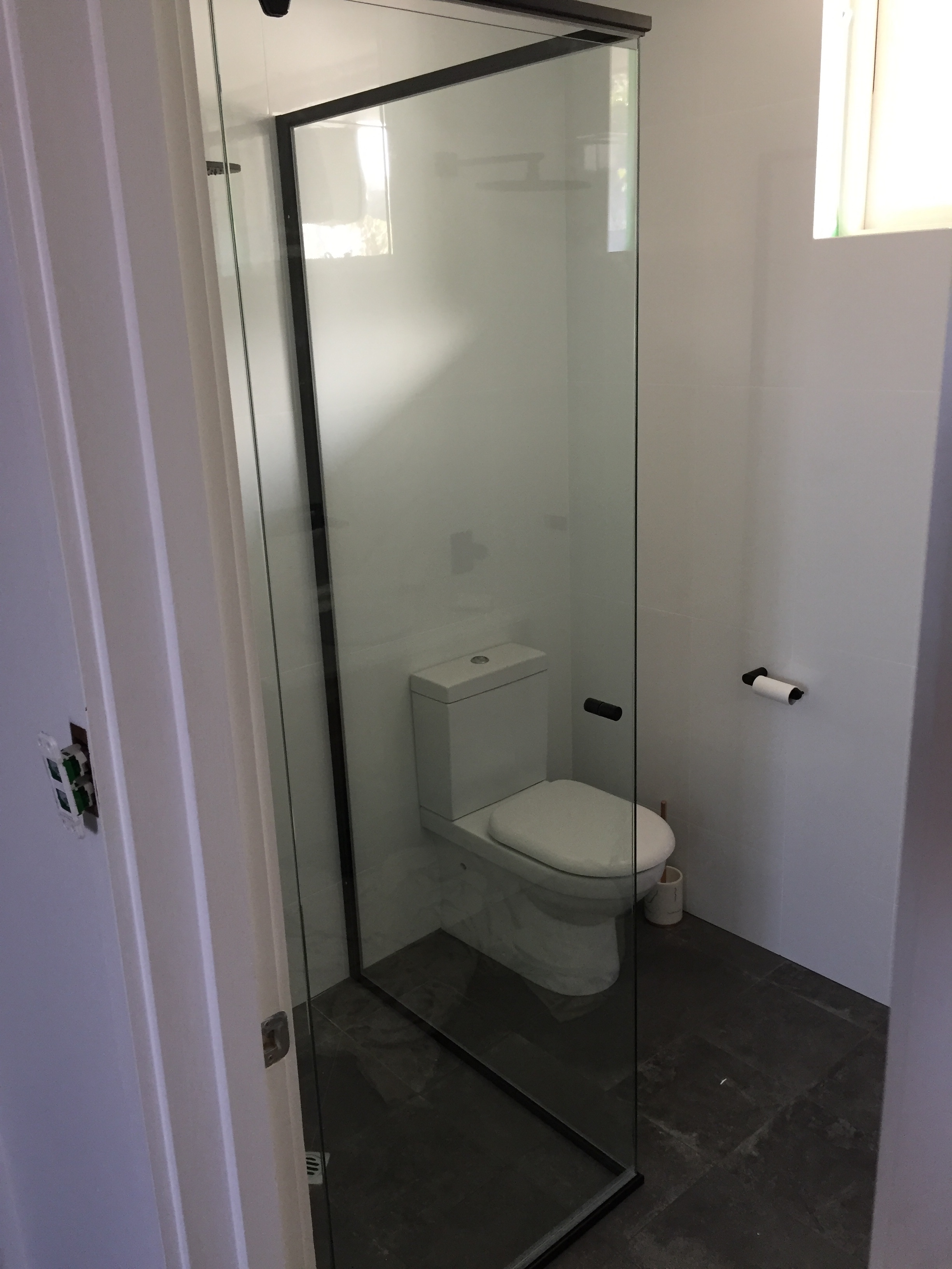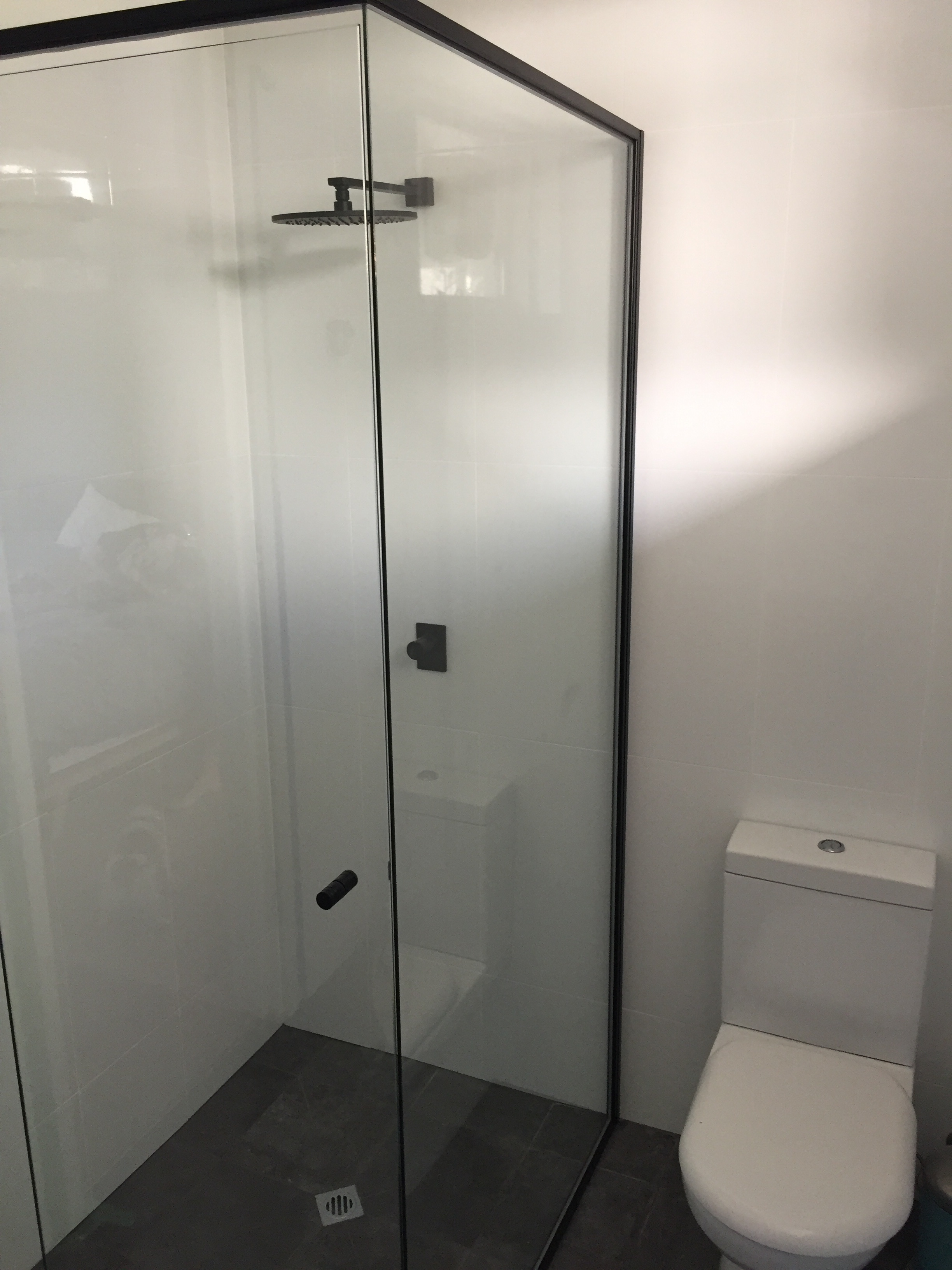 Shower screen, semi-frameless Matt black frame with pivot door.